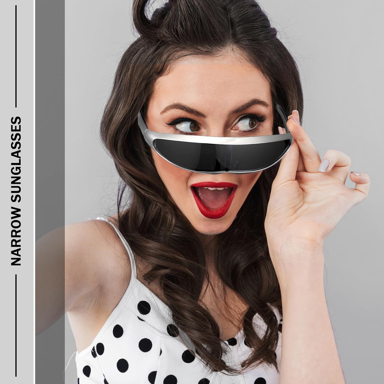 - Versatile Costume Accessory: these futuristic narrow visor sunglasses aren’t limited to regular outdoor use; They are suitable for various occasions like raves, festivals, cosplay, costumes, shopping, parties, photo booths, and travels; They are a suitable accessory for fun, stylish outfits you wear to your special events